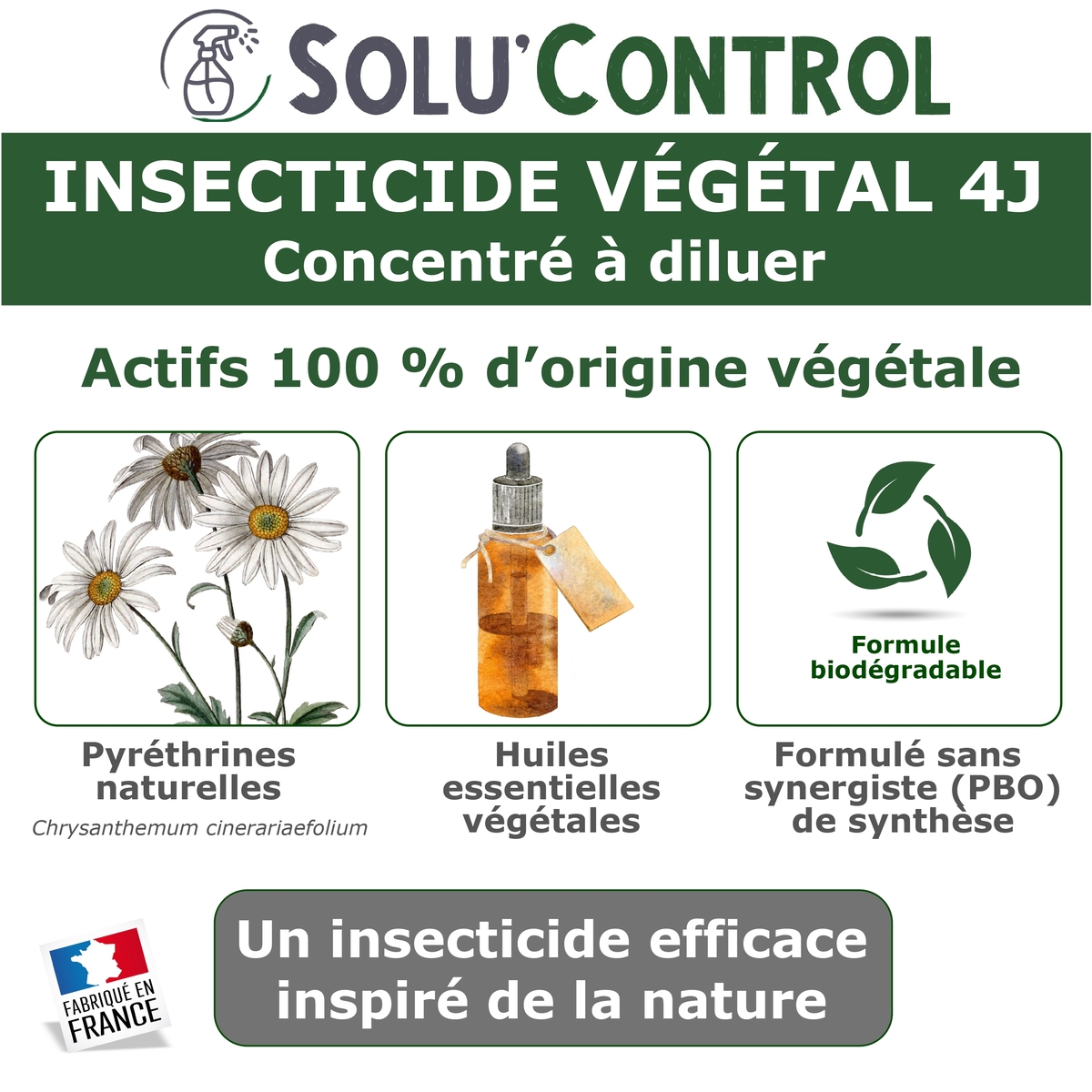 Insecticide fumigène, SOLU'FOGGER spécial Punaises de lit - Aérosol de 150ml La punaise de lit est connue pour se nourrir du sang des humains pendant leur sommeil. Mesurant environ 5 à 7 mm à l'âge adulte, elle se distingue par sa couleur brun rougeâtre et son corps ovale aplati. Ces nuisibles peuvent causer des désagréments significatifs, tels que des démangeaisons et des troubles du sommeil. Les punaises de lit se cachent généralement dans les matelas, sommiers, cadres de lit, et à proximité de leur source de nourriture, rendant leur éradication difficile. Elles se propagent facilement d'un endroit à un autre par le biais de vêtements, bagages, meubles d'occasion, et peuvent infester tant les habitations privées que les établissements publics. Leur capacité à survivre plusieurs mois sans se nourrir rend la lutte contre ces insectes particulièrement ardue, nécessitant souvent l'intervention de solutions professionnelles comme les traitements insecticides spécifiques. Formule renforcée = Effet choc Notre formule avancée est spécialement conçue pour combattre les infestations de punaises de lit, offrant une solution complète et durable. L'association unique de ces quatre composants, notamment la concentration exceptionnellement élevée en S-méthoprène, fait de notre produit un choix de premier ordre pour les professionnels et les particuliers à la recherche d'une protection efficace contre les punaises de lit. ✔️ Traitement pour 90m3 ou 50m2 par aérosol. ✔️ Efficacité testée par nos applicateurs. Solu'Fogger est spécialement conçu pour cibler et éliminer les punaises de lit à tous les stades de leur cycle de vie, offrant une solution rapide et efficace contre les infestations ✔️Effet choc et rémanent, action sur les nouvelles eclosions grâce au régulateur de croissance. Avec une concentration en S-méthoprène environ trois fois supérieure à celle des produits standards du marché, ✔️ Formulé et fabriqué en France. Combinaison de perméthrine, D-trans-allethrin, piperonyl butoxide, et S-méthoprène pour une action synergique et renforcée contre les punaises de lit. ✔️Régulateur de croissance 3 fois plus concentré pour une plus grande efficacité et une protection longue durée. Solu'Fogger offre une action préventive supérieure contre la reproduction des punaises de lit. ✔️Sécurité pour les habitations avec animaux : Peut être utilisé dans des maisons abritant des animaux domestiques, en suivant les précautions d'emploi spécifiques pour assurer leur sécurité. ✔️Adapté à tous les espaces : Solu'Fogger est idéal pour une utilisation dans les appartements, maisons, et même dans les espaces commerciaux, offrant une solution versatile pour tous les besoins de traitement. ⚠️ Utiliser les produits biocides avec précaution. Avant toute utilisation, lisez l'étiquette et les informations sur le produit Conditionnement : Aérosol One shot de 150 ml  Composition D-trans-métrine (CAS 1166-46-7) : 0.25% Perméthrine (CAS 52645-53-1) : 0.5% Butoxyde de pipéronyle (CAS 51-03-6) : 2.6% S-Méthopréne (CAS 65733-16-6): 0.1 % Dosage : Utilisez 1 aérosol par pièce (cuisine, chambre, salon, etc.) de moins de 90 m³ ou 50 m² 9503287939960 SOLU'FOGGER 2291