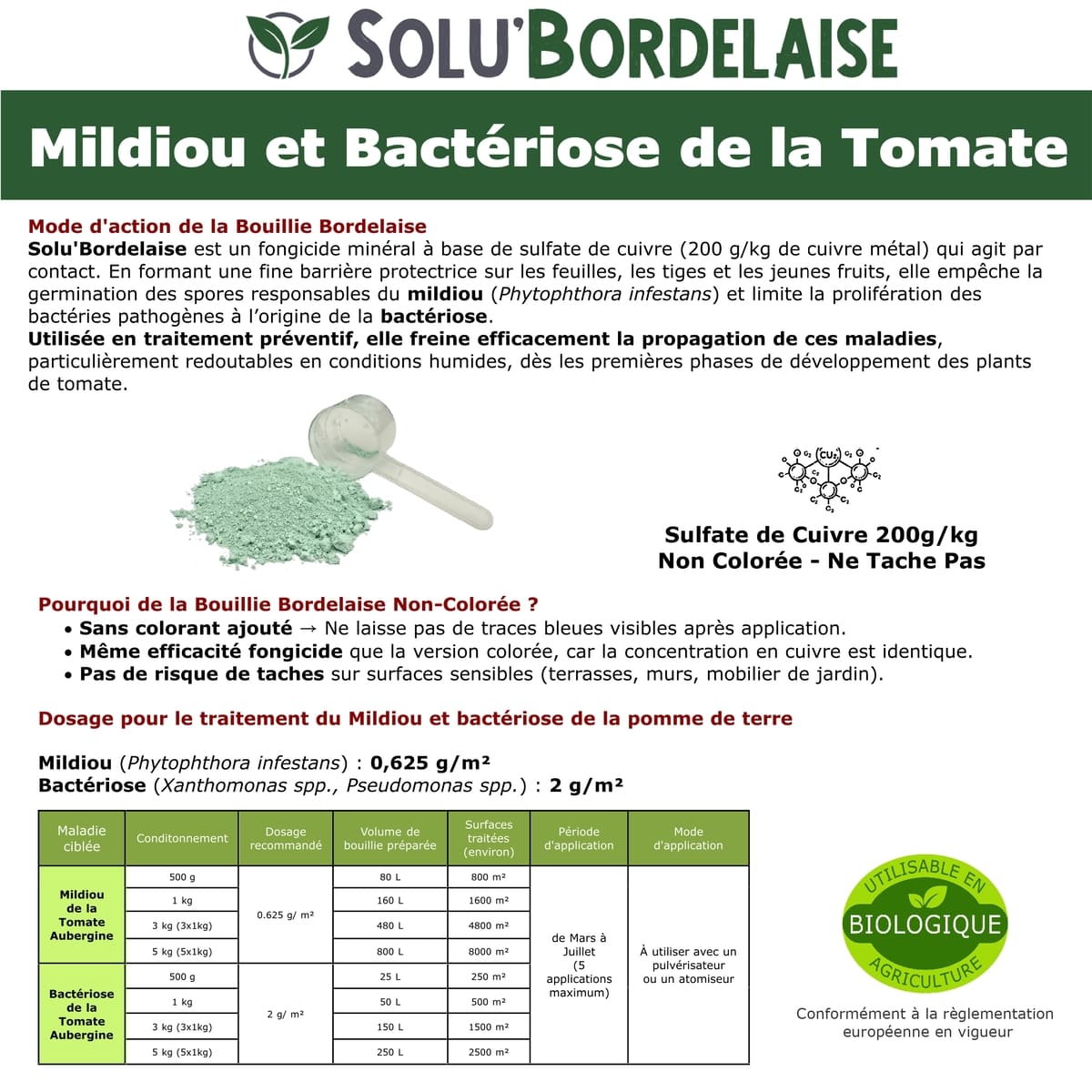 Solu'Bordelaise est un fongicide minéral à base de sulfate de cuivre (200 g/kg de cuivre métal), spécialement formulé pour protéger les tomates contre le mildiou (Phytophthora infestans) et la bactériose. Elle agit par contact, formant une barrière protectrice sur les feuilles et les tiges, empêchant la germination des spores et limitant efficacement leur propagation.