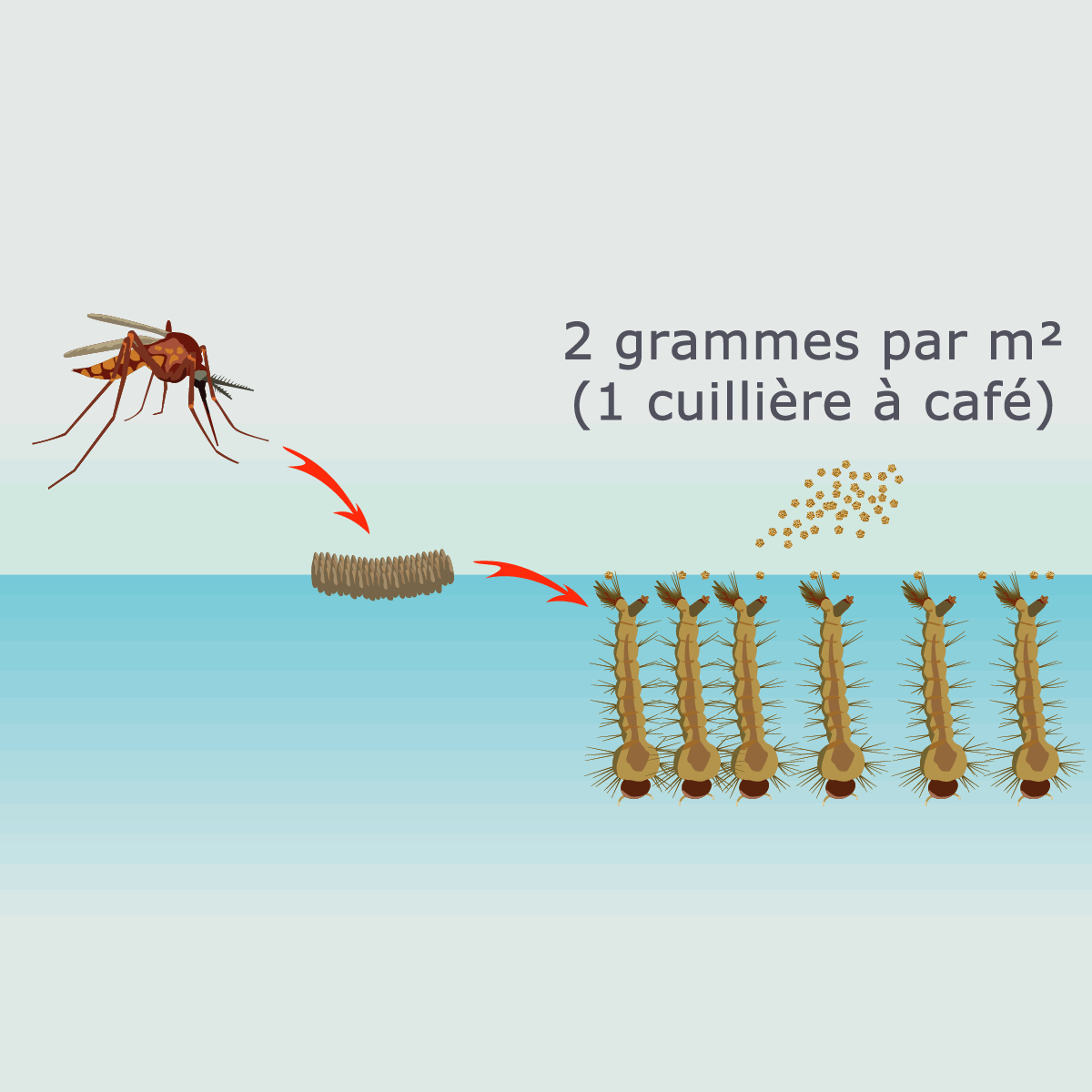 Dès l'apparition des première larves, dispersser les granulés dans l'eau. L'effet larvicide intervient dans les 12 à 18h suivant le traitement.